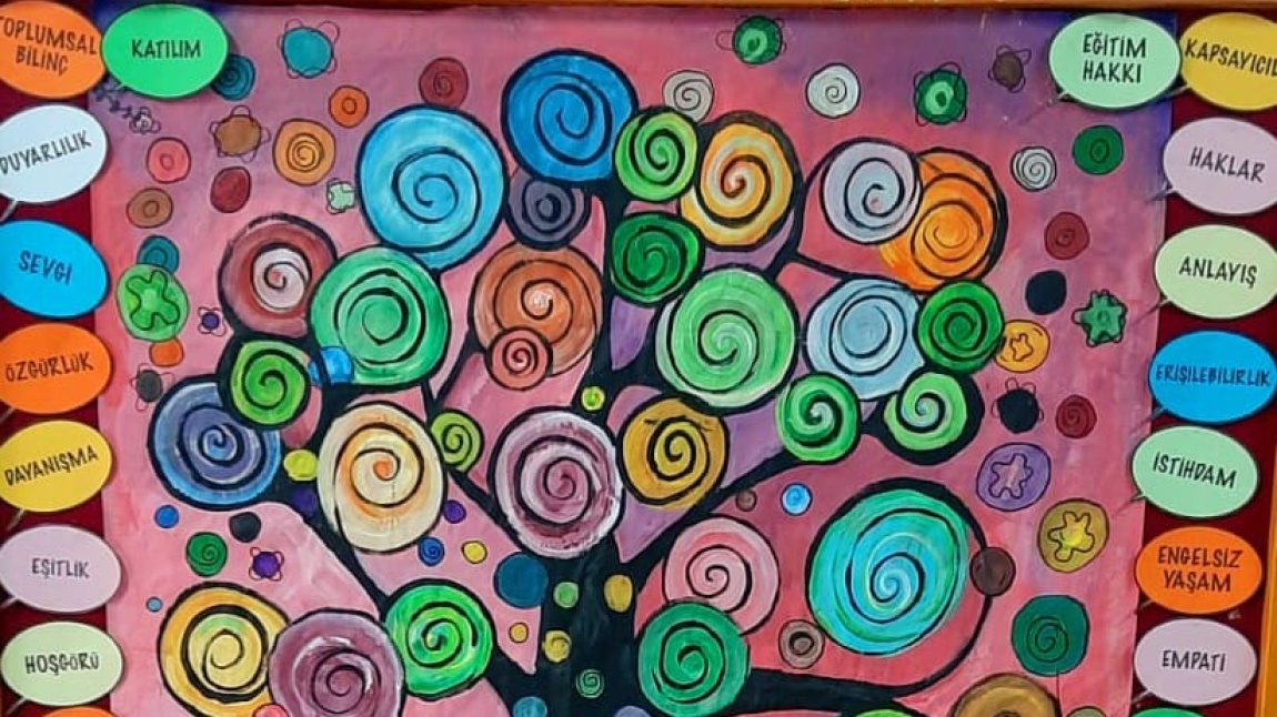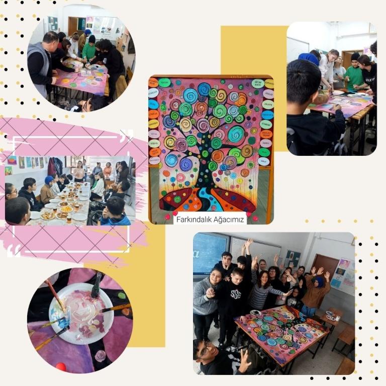 Ardından resim öğretmenleriyle birlikte farkındalık ağacını boyayan çocuklar, renkleriyle dünyayı güzelleştirirken kendi mutluluklarını da birer iz gibi yapraklara işlediler.